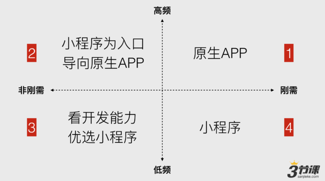 在《关于微信小程序,这是三节课的全部看法和建议》这篇文章里,我们已经提过,并不是说所有的服务都是适合接入小程序的。在此不妨回顾一下当时我们提出的四象限图。