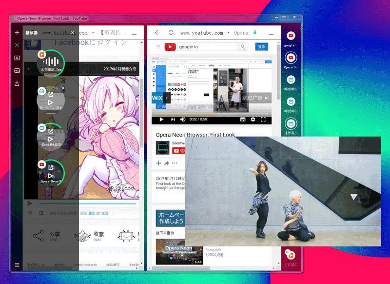-Neon在Windows系统下多媒体流监控、网页双开、视频“画中画”的演示(注:红、蓝、绿相间的背景是我的电脑墙纸)。